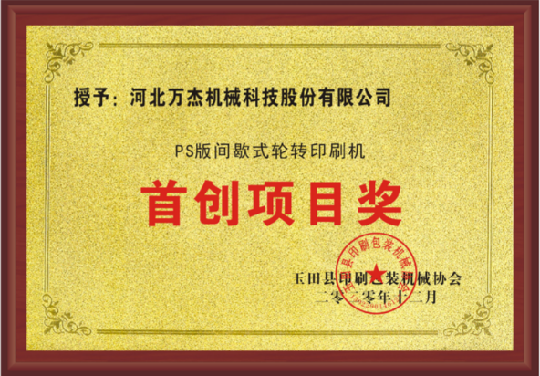 2020年12月荣获PS版间歇式轮转印刷机首创项目奖