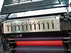 ● 水墨控制:本机采用美国先进的供墨供水系统,有效保证了高、低速下的水墨平衡及颜色稳定,充分保证了印品光亮度;供水供墨系统通过桥辊在一支着版辊上实现水墨合一的经典结构,大大降低了材料的浪费;国内浮动着版辊的使用,有效防止了墨杠及鬼影产生,膜类、纸类均可轻松印刷。